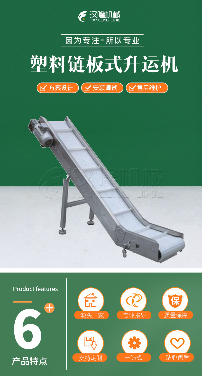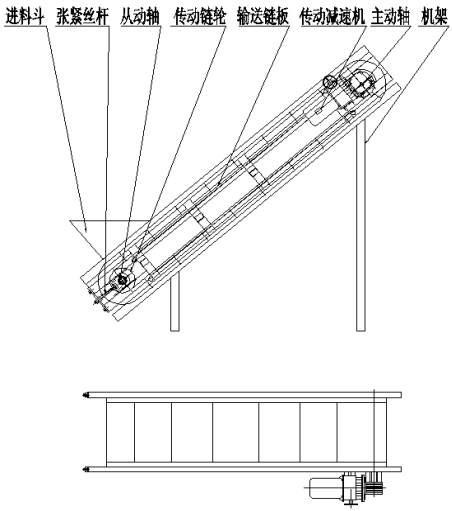 该提高了机由机架、注塑产品斗、张紧丝杆、卸料链板、积极主动轴、从动轴、传输数据油封、转动缓速机等部位构成的。