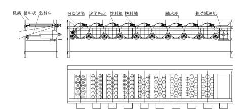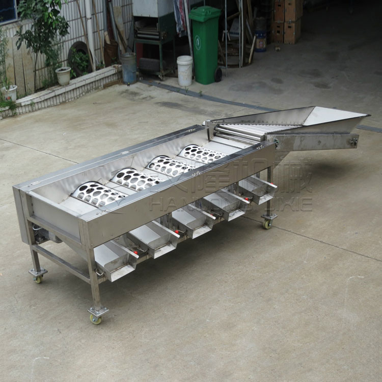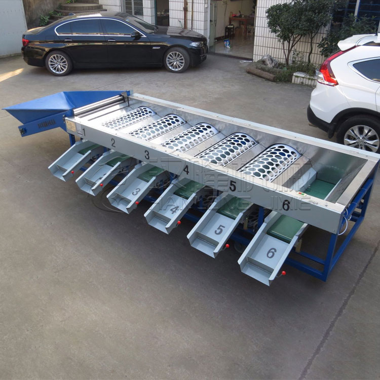 该机型型由人工服务装料或升降机装料进来该机型型,下设不一样的尺寸圆形的分类制度辊子从渣浆泵口处循序布置在辊子托盘的的上(最窄孔的分类制度辊子在渣浆泵口处,向后是以辊子上孔的的尺寸,生来到大布置)。传输链缓速机用链接传输链带领拨料辊后,再用链接带领辊子托盘的的,而使运动或者单方向运动辊子;当圆果进来分类制度机后,小的圆果便会用辊子上的圆形掉出入库进料斗中;而刚进校点的圆果会在前个辊子的运动或者单方向运动下滚到下个刚进校点孔的辊子上,来分类制度给料。若圆果分类制度的时候中出现了卡在辊子的圆形中时,在辊子的内部人员下设拨料辊,把卡住的圆果顶出辊子,并在拨料轴的效应下,迅速的将圆果送至下个分类制度辊子上。