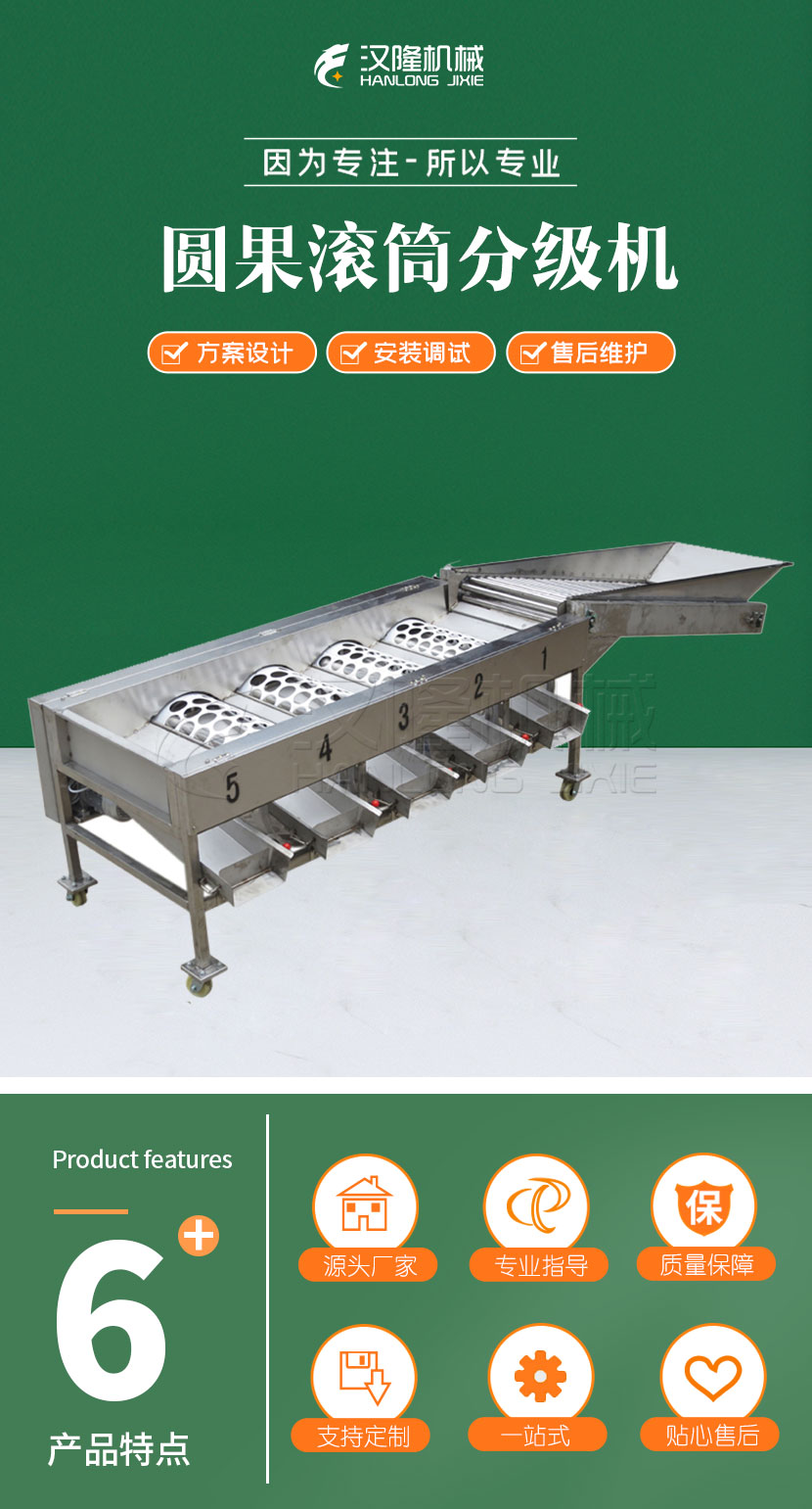 该设备是根据很多辊子上的多种圆形来可达划分管理圆果。该设备制作独特,制作先进性,适于于一些圆果的划分管理。如苹果系统、桔子、 橘子、柚子等。